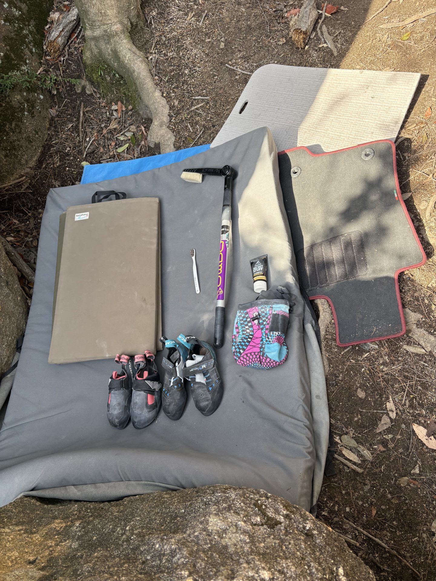 ①クライミングシューズ 2足 ⓶サブマット ③ブラシ 大・小